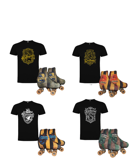 Conjuntos de t-shirts pretas com logotipos das casas de Harry Potter e patins de rodas coloridos correspondentes a cada casa