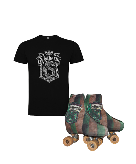 T-shirt preta Slytherin e patins de rodas verdes e castanhos Slytherin
