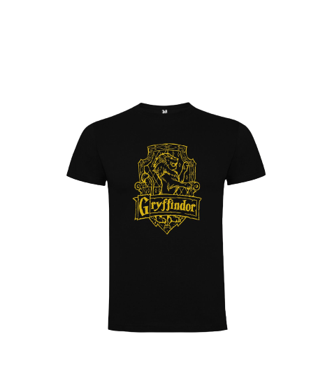 T-shirt preta com brasão dourado da Casa Gryffindor e texto