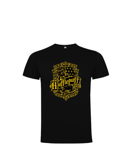 T-shirt preta com brasão amarelo da casa Hufflepuff