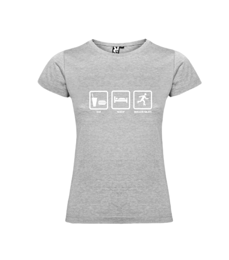 T-shirt feminina cinzenta com estampado branco e texto Eat Sleep Roller Skate