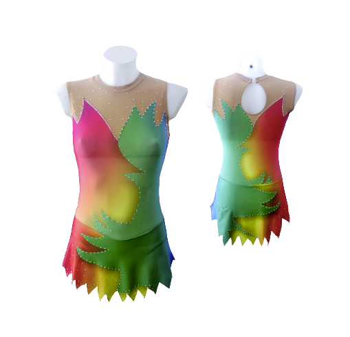 Vestido colorido de ginástica rítmica com strass e recortes irregulares